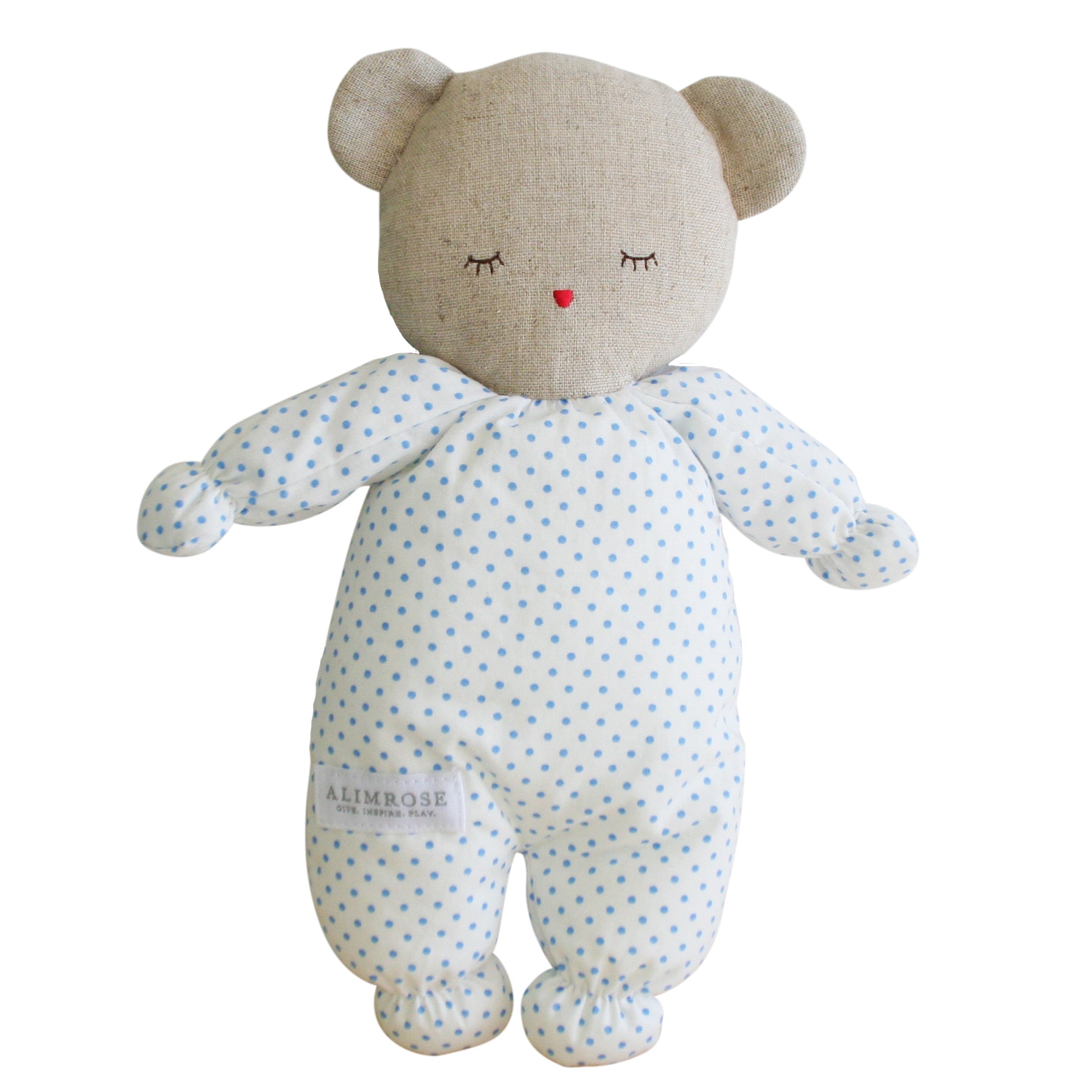 Are you awake or asleep? How cute is this asleep/awake teddy by Alimrose. Fits perfectly in the baby doll carry bag. One side has asleep eyes and on the reverse has awake eyes. Suitable from 3 years