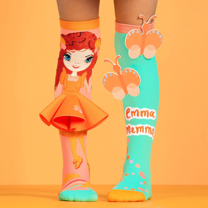 Dance into Twirling Tuesdays with our Emma Memma socks! These socks have custom 3D attachments with Emma's iconic tutu skirt on one sock and 3D butterflies with silver glitter on the other! These are perfect for anyone who loves to bop and twirl while listening to Emma's twirling tunes on repeat! 🩰👯