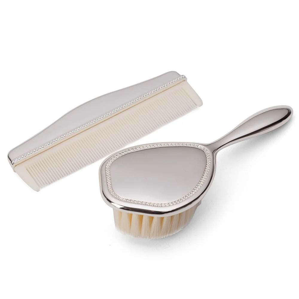 This shimmering set includes a fine-toothed silver-plated comb and a silver-plated brush with soft bristles. Each piece of this set is embossed with a fashionable beading around the edges, sleek and modern.