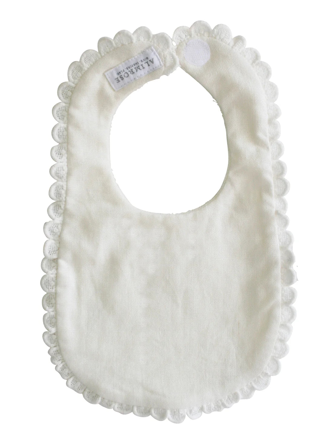 This gorgeous ivory linen bib with a lace edge by Alimrose is the perfect addition to your little girl's wardrobe. Style her for mealtimes. Comfort fit with a velcro closure and machine washable for ease of cleaning. Can be used for special events such as on top of christening gown to keep it clean and for an aesthetically pleasing look.